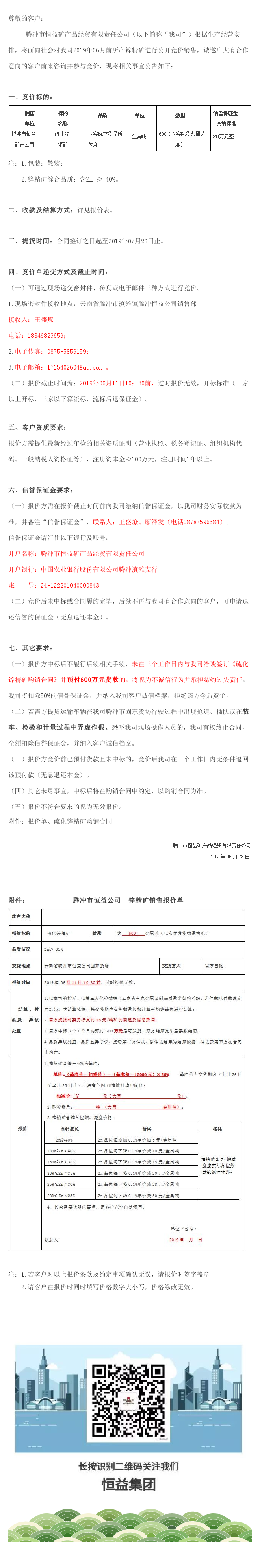 騰沖市恒益礦產(chǎn)品經(jīng)貿(mào)公司關(guān)于鋅精礦競(jìng)價(jià)銷售公告(201904)號(hào) 來(lái)源: 瀏覽量:7870 日期:2019-05-28 分享到: 上一篇:高黎貢國(guó)際健康旅居小鎮(zhèn)低層住宅八組團(tuán)-江山小院精裝樣板房裝修施工工程招標(biāo)公告 下一篇:騰沖市恒益礦產(chǎn)品經(jīng)貿(mào)公司關(guān)于鋅精礦競(jìng)價(jià)銷售公告(201903)號(hào)