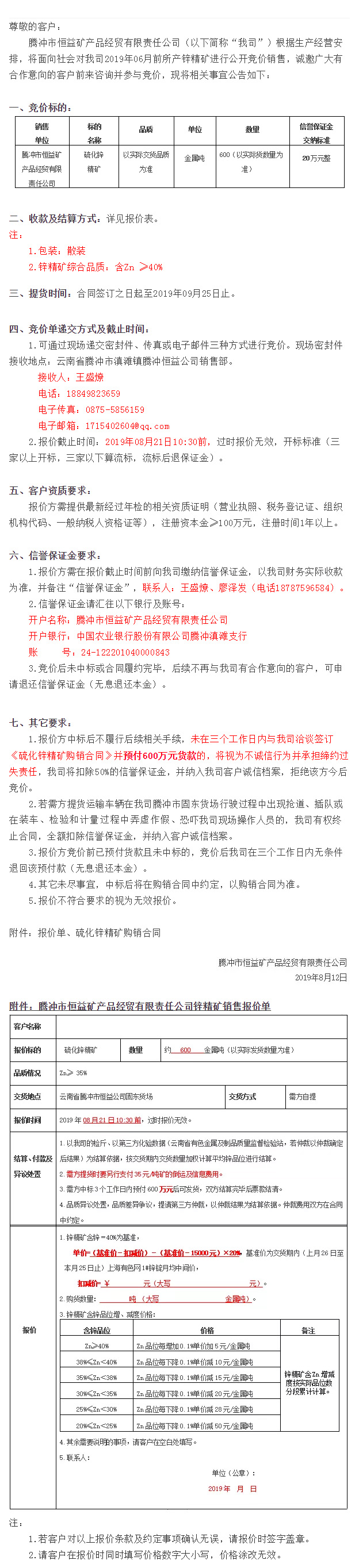 騰沖市恒益礦產(chǎn)品經(jīng)貿(mào)有限責(zé)任公司關(guān)于鋅精礦競價銷售公告(201905)號 來源: 瀏覽量:8749 日期:2019-08-13 分享到: 上一篇:騰沖市恒益礦產(chǎn)品經(jīng)貿(mào)有限責(zé)任公司關(guān)于鋅精礦競價銷售公告(201905)號 下一篇:高黎貢國際健康旅居小鎮(zhèn)低層住宅八組團—江山小院門頭及圍墻工程招標(biāo)公告