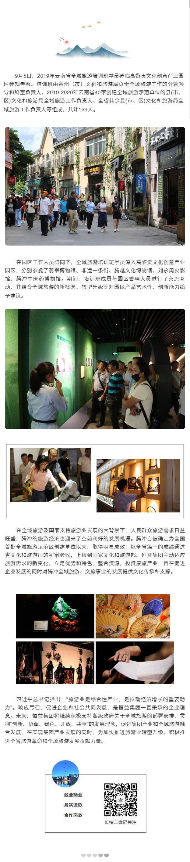 2019年云南省全域旅游培訓(xùn)班學(xué)員參觀高黎貢文化創(chuàng)意產(chǎn)業(yè)園區(qū) 來源: 瀏覽量:6731 日期:2019-09-06 分享到: 上一篇:恒益集團(tuán)組織召開2020年全面預(yù)算編制啟動(dòng)及培訓(xùn)會(huì) 下一篇:恒益集團(tuán)組織開展資金集中管理培訓(xùn)