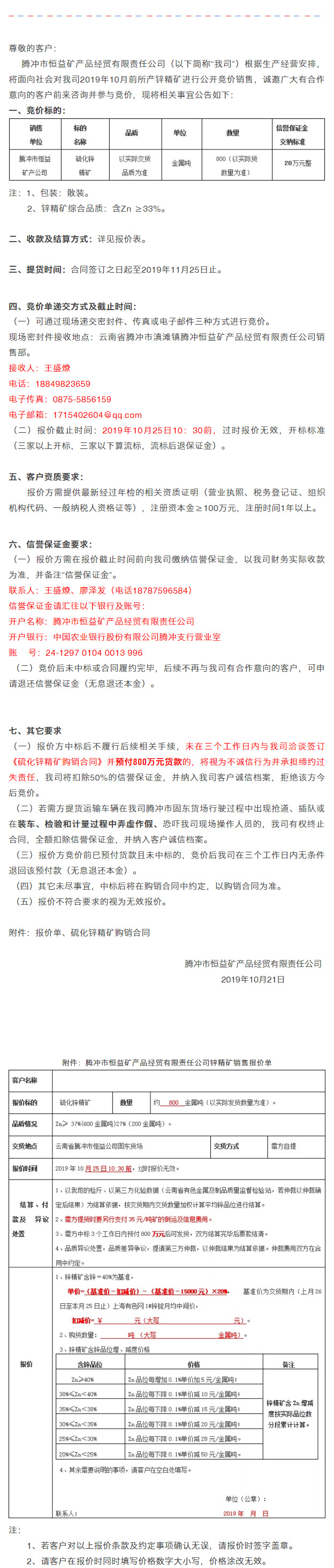 騰沖市恒益礦產(chǎn)品經(jīng)貿(mào)有限責(zé)任公司關(guān)于鋅精礦競(jìng)價(jià)銷售公告(201910)號(hào) 來源: 瀏覽量:8323 日期:2019-10-22 分享到: 上一篇:騰沖市恒益礦產(chǎn)品經(jīng)貿(mào)有限責(zé)任公司關(guān)于鋅精礦競(jìng)價(jià)銷售公告(201911)號(hào) 下一篇:騰沖市恒益礦產(chǎn)品經(jīng)貿(mào)有限責(zé)任公司關(guān)于鋅精礦競(jìng)價(jià)銷售公告(201905)號(hào)