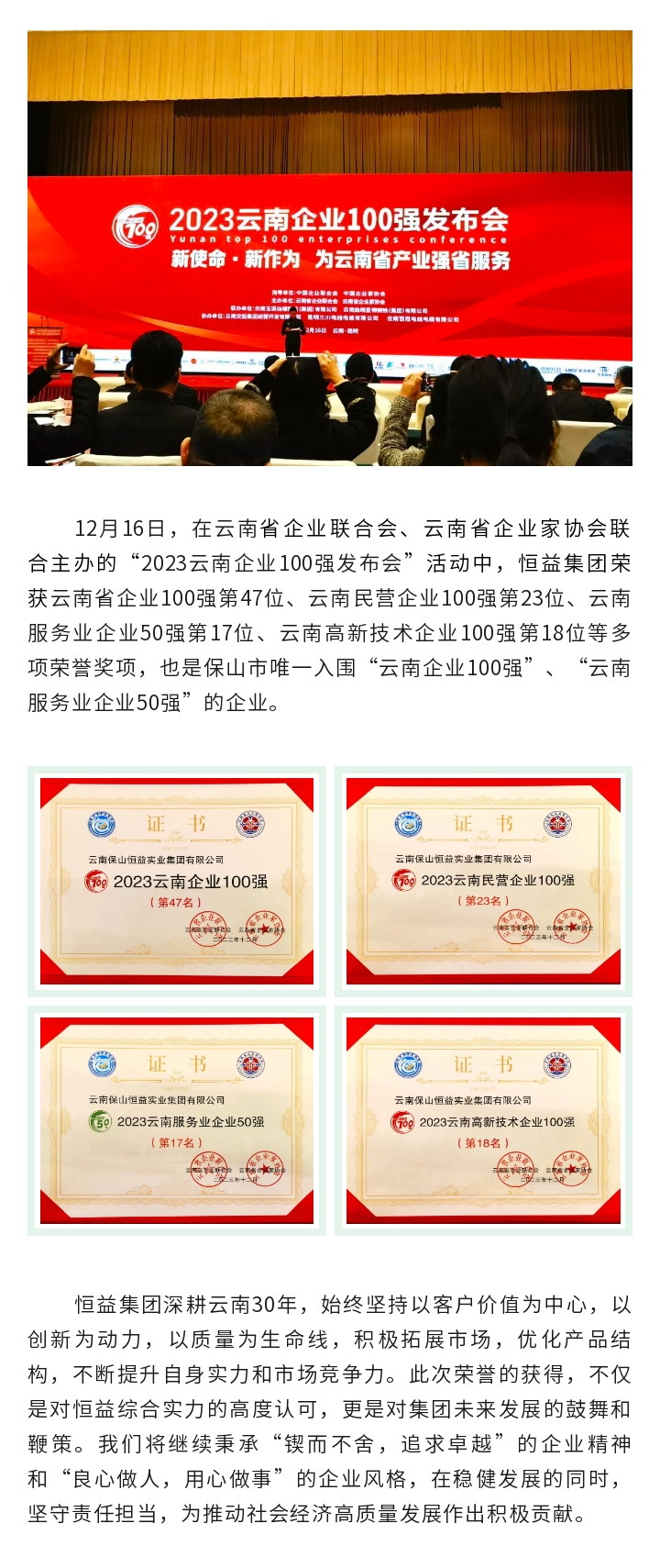 喜訊丨恒益集團(tuán)獲得“2023云南企業(yè)100強(qiáng)”等多項(xiàng)榮譽(yù)獎(jiǎng)項(xiàng) 來(lái)源: 瀏覽量:3371 日期:2023-12-16 分享到: 上一篇:考察聯(lián)誼謀發(fā)展,合作共贏譜新篇 下一篇:騰沖市恒益礦產(chǎn)品經(jīng)貿(mào)有限責(zé)任公司滇灘鐵礦東排土場(chǎng)建設(shè)項(xiàng)目環(huán)境影響評(píng)價(jià)公眾參與第二次信息公示