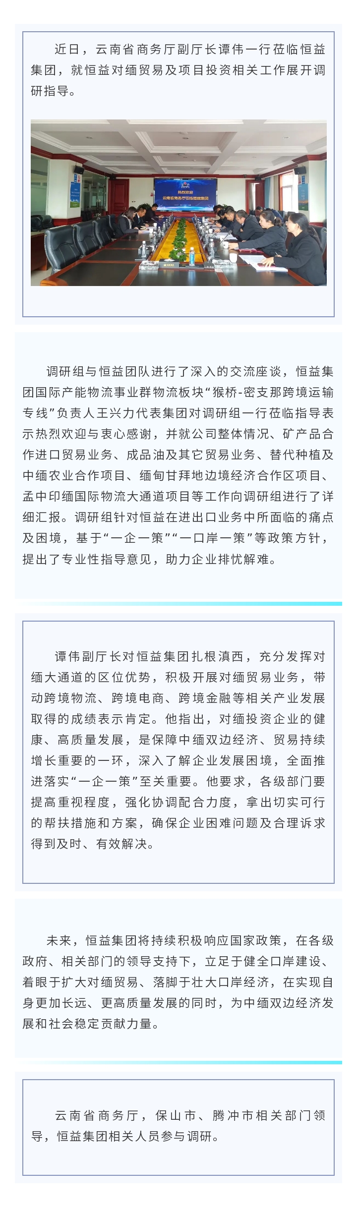 云南省商務(wù)廳副廳長譚偉一行蒞臨恒益集團(tuán)調(diào)研指導(dǎo) 來源: 瀏覽量:1403 日期:2025-02-24 分享到: 上一篇:騰沖召開領(lǐng)導(dǎo)干部掛鉤服務(wù)企業(yè)專題會(huì) 下一篇:恒益集團(tuán)召開2025年產(chǎn)業(yè)創(chuàng)新目標(biāo)及任務(wù)分解工作指導(dǎo)會(huì)