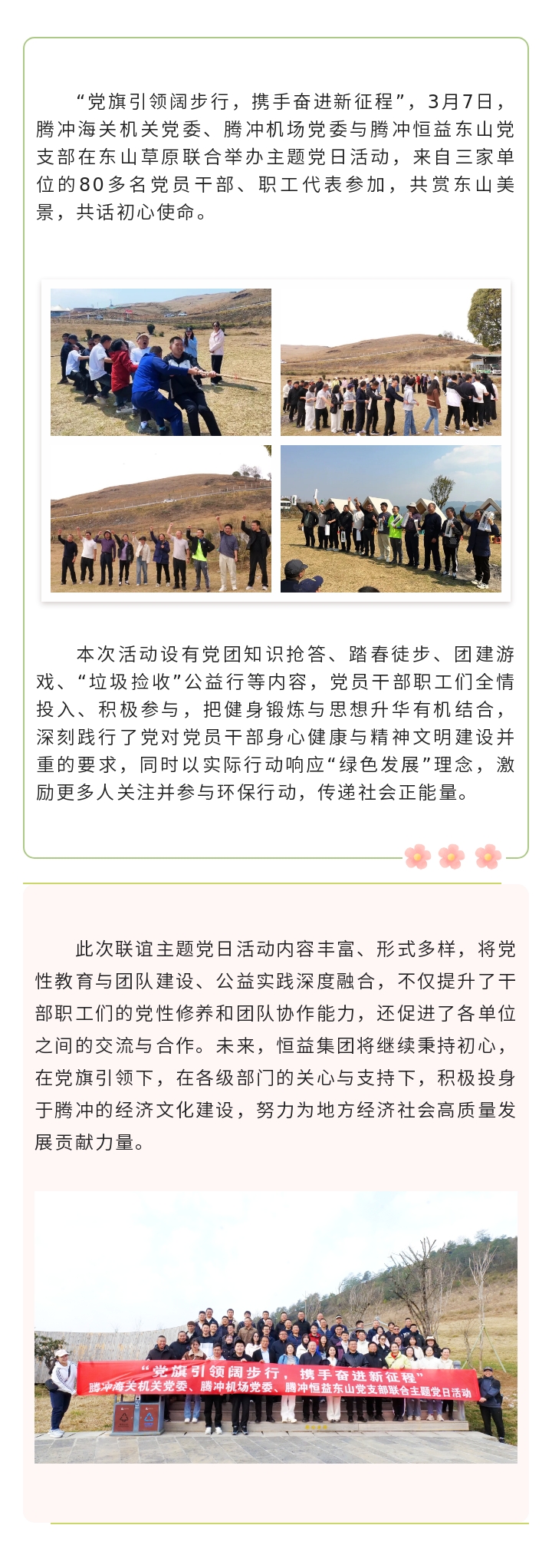 騰沖海關(guān)機關(guān)黨委、騰沖機場黨委及騰沖恒益東山黨支部聯(lián)誼主題黨日活動圓滿舉行 來源: 瀏覽量:1124 日期:2025-03-07 分享到: 上一篇:巾幗綻芳華,健康共守護丨恒益集團積極協(xié)助騰沖市 “三八”國際婦女節(jié)活動圓滿舉行 下一篇:騰沖召開領(lǐng)導(dǎo)干部掛鉤服務(wù)企業(yè)專題會