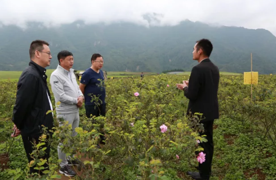 6月3日,調(diào)研組一行在恒益集團(tuán)總裁彭良波、董事朱旭東及相關(guān)高管的陪同下,對(duì)恒益大馬士革玫瑰項(xiàng)目進(jìn)行實(shí)地調(diào)研參觀,先后到達(dá)了大馬士革玫瑰明光種植基地、玫瑰觀光莊園、固?hào)|玫瑰品種資源科普基地、玫瑰臨時(shí)加工車(chē)間。期間,露絲福公司總經(jīng)理彭文濤就大馬士革玫瑰項(xiàng)目建設(shè)情況、下步發(fā)展定位及產(chǎn)業(yè)規(guī)劃作了詳細(xì)匯報(bào)。針對(duì)產(chǎn)業(yè)下步發(fā)展方向、產(chǎn)品開(kāi)發(fā)、一二三產(chǎn)業(yè)融合等,羅軍書(shū)記與彭良波總裁、彭文濤總經(jīng)理進(jìn)行了深入溝通。同時(shí),彭良波總裁就玫瑰項(xiàng)目所帶來(lái)的精準(zhǔn)扶貧、農(nóng)民增收、經(jīng)濟(jì)效益方面也作了深入分析。